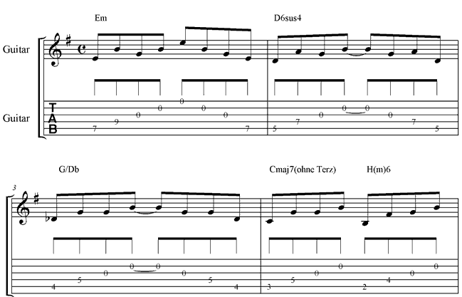 Basistonart der Nummer ist E-Moll, die parallele Moll-Tonart von G-Dur. Dementsprechend startet auch unser Jam-Track standesgemäß mit einem E-Moll Akkord. Die Basis des verwendeten Voicings bildet ein normaler Powerchord (Grundton und Quinte). Seinen interessanten Sound erhält der in jeder Art Rockmusik gerne gesehene Akkord, durch den geschickten Einsatz von Leer-Saiten. So übernimmt die leere G-Saite in dem Voicing die Aufgabe der kleinen Terz, die B-Saite arbeitet als Quinte und die hohe E-Saite als oktavierter Grundton. Auch der zweite Akkord basiert auf einem Powerchord, der durch den Sound leerer Saiten in Szene gesetzt wird. Hier arbeitet die G-Saite als sus4 und die B-Saite als gr.6. Im nächsten Akkord, einem G/Db, lässt sich die G-Saite als Grundton und die B-Saite als gr.3. deuten Das Db im Bass verbindet die beiden Nachbarakkorde zur "rechten" und "linken" (D6sus4 und Cmaj7) chromatisch miteinander. Der Cmaj7 im ersten Teil des vierten Takts wird erneut im Powerchord-Stil gegriffen. Die entscheidenden Zusatztöne liefert die G-, und B-Saite. Dabei ist das G die Quinte, das B die maj7 (gr.7). Ihren Abschluss findet die Kadenz in einem Hm6 Akkord. Und auch dieser Powerchord erhält durch die jeweils leer gespielte G- und B-Saite den letzten Schliff. Eine ausführliche Analyse des Solos findest du auf der nächsten Seite. |
