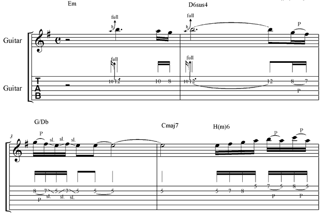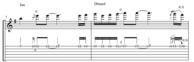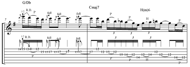 Faith Phrasing und Bending Seite 2Die AnalyseBis auf den verwendeten G/Db stammen alle verwendeten Akkorde aus der G-Dur Skala. Und so ist diese Tonleiter (neben der E- Blues-Scale) auch bei der Improvisation die erste Wahl. Das Solo startet mit einem gefühlvollen Bending/Rebend von A auf B und zurück Achte beim "Benden" darauf, dass du das erste Ziehen der Saite relativ langsam und kontrolliert auszuführst, bevor du die gezogene Note auf der "4+" wieder zurück zu ihrem Ursprung, dem Ton A (10 Bund B-Saite) bringst. Das zweite Bending auf der "1" des zweiten Takts kommt entsprechend schneller zum Ziel und wird auf ihrem Höhepunkt durch ein dezentes Vibrato verziert. Auf der "4+" startet ein Lauf der bis in den dritten Takt reicht und mit einigen Slidings aufgemotzt wurde. Dabei verwende ich für die Töne G und F# (8.Bd/7.Bd B-Saite) den Zeige-, und Mittelfinger. Das Sliding zum E (5.Bd.) auf der "1+" erledigt man entsprechend mit dem Zeigefinger. Auch die nachfolgenden Slides werden mit dem Zeigefinger abgearbeitet. Der vierte Takt endet mit einem Lauf der uns zur "1" des fünften Takts führt, dem Ton "B" (7.Bund E-Saite) |