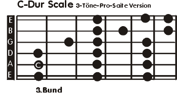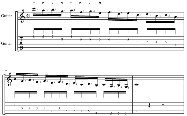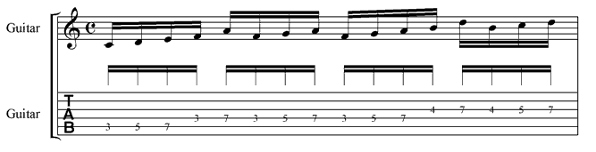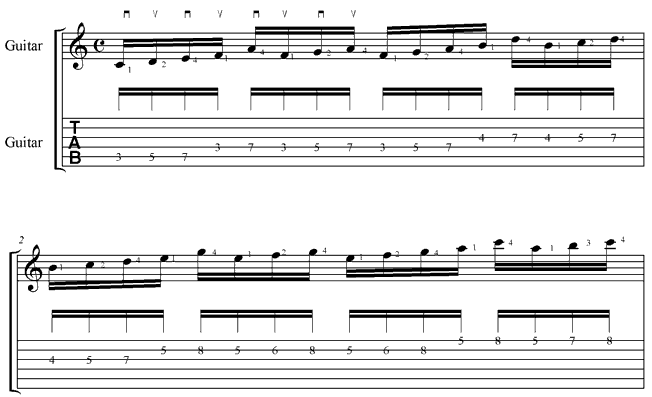 Unsere erste Studie basiert auf einer acht Noten umfassenden Sequenz, die ich konsequent auf den Fingersatz einer Version der 3-Töne Pro Saite C-Dur Skala angewendet habe. Hier zunächst einmal die pure Sequenz: