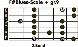 Anschließend fräst er sich quer durch die F# Blues Scale, verziert durch eine große None (G#) im ersten Bund der G-Saite.