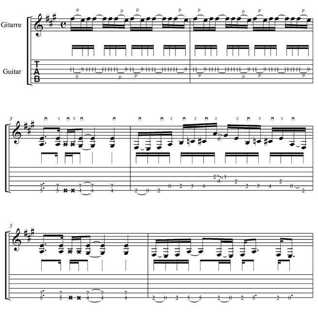Entscheidend für die Wirkung des Riffs ist der stetige 16'tel Beat. Achte beim Üben unbedingt auf die im Notentext angegebenen Ab- und Aufschlagzeichen. Trainiere die Linie zunächst sehr langsam und mach dich so intensiv mit ihrer Struktur vertraut. So kriegst du das Riff-Monster schnell in den Griff. Wenn du weißt wo es lang geht, kannst du auf's Gaspedal treten. |