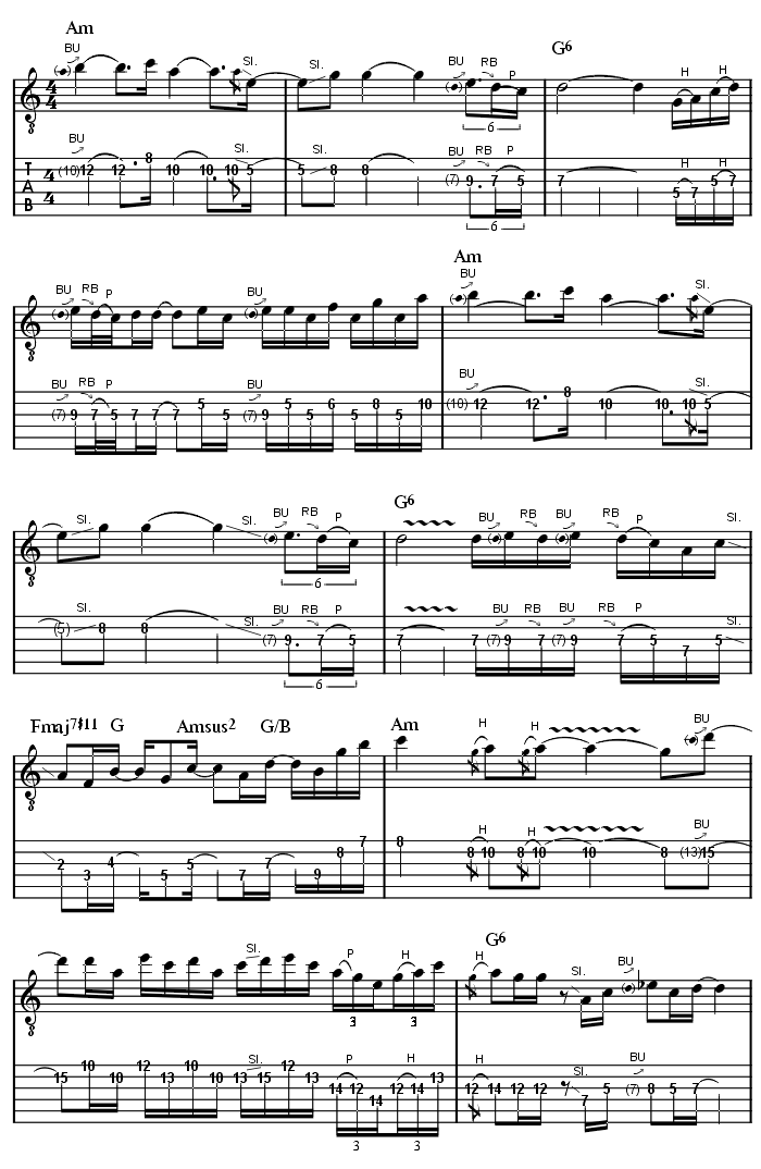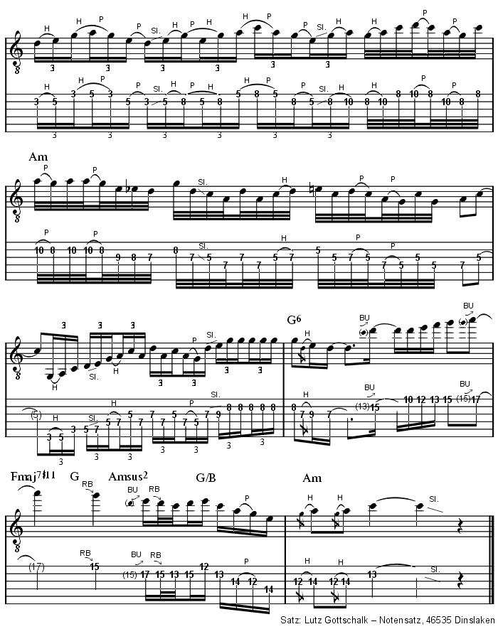TIPP: Eines muß von vornherein klar sein! Das Solo ist technisch nicht ganz leicht zu meistern. Gerade die Passagen im zweiten Teil der Studie, haben es ganz schön in sich. Falls du spieltechnisch noch nicht soweit fortgeschritten sein solltest, um das komplette Teil auf die Reihe zu bekommen, dann empfehle ich dir, deine Aktivitäten zunächst einmal nur auf den ersten Teil der Studie zu beschränken. Und das ist sicher nicht weiter schlimm, denn auch dieser Part des Solos bietet dir, mit seinen coolen Bendings und dem sehr melodiösen Ansatz, ein interessantes, pentatonisches Betätigungsfeld. Hör dir das Audio mehrmals hintereinander an, um dich mit dem Ablauf und der Melodie richtig vertraut zu machen. Danach ist es an der Zeit dich, Takt für Takt durch die Nummer zu fräsen. Natürlich hält dich niemand davon ab, auch schon einmal die härteren Passagen anzutesten. Denn du weißt ja: Übung macht den....!