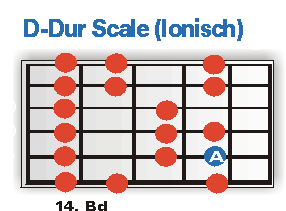Der auftaktige Einstieg in den Song hat es rhythmisch ziemlich in sich. Grund genug, den Part noch detaillierter unter die Lupe zu nehmen. Das folgende flashanimierte Notenbild inklusive Super-Slomo Audio kann dir dabei helfen, das Intro in den Griff zu kriegen. TIPP: Falls du noch keine Erfahrungen mit dem Spielen von Quintolen gemacht hast, empfehlen wir dir einen Blick in einen unserer älteren Liwos zu werfen. Klick auf den Link und schon geht's los. Aber wiederkommen! Nachdem Carlos sich mit dem Intro ins Spiel gebracht hat, geht es im dritten Takt des Solos mit einem typischen Sliding-Lick in die 14. Lage. Das Griffbild der D-Dur Skala, in der sich Carlos in den nächsten fünf Takten seines Solo-Parts austoben wird, sieht folgendermaßen aus: