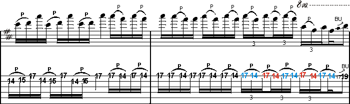 Trotz der verwendeten Dreitonfolgen, rhythmisiert Carlos den Lauf nicht in Triolen, sondern in Sechzehnteln. Die sich aus dieser Maßnahme ergebende Verschiebung, macht das Pattern wesentlich interessanter, als es in der einfacher zu realisierenden Triolen-Version wäre. ÜBRIGENS: Weitere Tipps zum Thema "Drei Gegen Vier" findest du im dritten Teil unseres Tapping Specials! Aber das ist noch nicht alles. In der zweiten Hälfte des sechsten Taktes setzt Santana noch einen drauf, geht den umgekehrten Weg und "exportiert" eine typische Zweitonfolge, in einen reinrassigen Sechzehnteltriolen-Rhythmus.