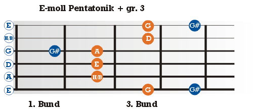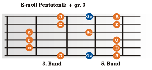Vergleiche einmal die oben abgebildeten E-Moll-Pentatonik-Fingersätze mit Riffs deiner Lieblings-Rocker. Du wirst feststellen, dass viele deiner "Favorites" auf genau diesen Skalen basieren. Unser Wes Borland-Riff macht da keine große Ausnahme. Um sich trotzdem ein wenig von der Masse abzuheben, bedient sich Wes eines kleinen Trix. Er unterstreicht den Dur-Sound des Riffs durch den Einsatz eines zusätzlichen Tons, der großen Terz (G#/E-Saite 4.Bd.). In der Abbildung haben wir diesen Ton übrigens BLAU dargestellt. Dieser Ton hat in Verbindung mit dem G (kl.Terz) aus der Moll-Pentatonik maßgeblichen Anteil am hippen Sound des Riffs. Lass dich von unserem Hörbeispiel doch auch zu eigenen Experimenten mit der E-Moll-Pentatonik inspirieren. Als Groove-Support kannst du den puren DrumTrack verwenden, den ich dir als MP3 zur Verfügung gestellt habe. Have A Try !! |