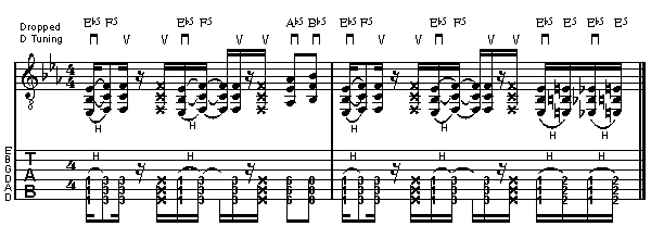 Nutze für deine Studien auch den puren "Drum Track". So macht das Üben noch mehr Spaß. TIPP: Die wohl schwierigste Bewährungsprobe steht schon direkt am Anfang der Nummer auf dem Plan. Du hast ja in dem Flash-Film gelernt, das man Powerchords innerhalb eines "Dropped D-Tunings" mit nur einem Finger greift (Barré-Griff). Ich denke, das wird dir keine großen Schwierigkeiten bereiten. Doch "Take It" setzt noch einen drauf. Hier sollst du aus dem Eb5-Powerchord mittels eines Hammerings direkt in den F 5-er rüberhämmern. Und das kann bei Gitarristen mit wenig Spiel-Erfahrung schon mal zu erheblichen Problemen führen. Falls du also Schwierigkeiten mit diesem Part haben solltest, empfehle ich dir, dich zunächst einmal ganz intensiv mit ausschließlich diesem Teilausschnitt zu beschäftigen. Spiele die Hammering-Arie sehr, sehr langsam, so dass du wirklich noch alles kontrolliert ausführen kannst. Außerdem rate ich Dir, das Riff auf jeden Fall mit deinem Verstärker im verzerrten Modus zu üben. Nur so hörst du eventuell entstehende ungewollte Nebengeräusche und du kannst frühzeitig damit beginnen, diese abzustellen. Falls du mehr zum Thema Powerchords, Scales, Rhythmik etc. erfahren willst, buch' doch einfach mal einen Probe-Kurs in der Planet-Guitar School. Es lohnt sich !!! |