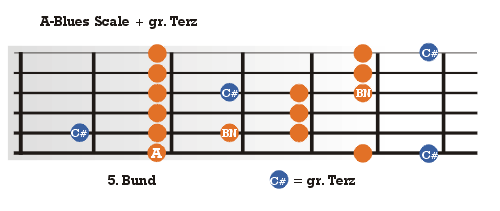 Der Lick startet mit einem echten Repeating Pattern, das tonleitermäßig auf der A Moll Pentatonic/Blues Scale basiert. Besonders erwähnenswert ist der Gebrauch von Sechzehntel-Triolen, der dem Lick seinen besonderen Kick verleiht. Im zweiten Takt erweitert Robert das Tonmaterial der A Blues Scale, mit einer zusätzlichen großen Terz (C#). Das ist eine sehr gebräuchliche Aktion, die man von Gitarristen aus allen Stilbereichen kennt. ÜBRIGENS: Zur besseren Übersichtlichkeit, haben wir dir die große Terz im Notentext, mit einem überaus dezenten blau kenntlich gemacht. Die komplette A Blues Scale mit amtlicher Erweiterung, sieht folgendermaßen aus: