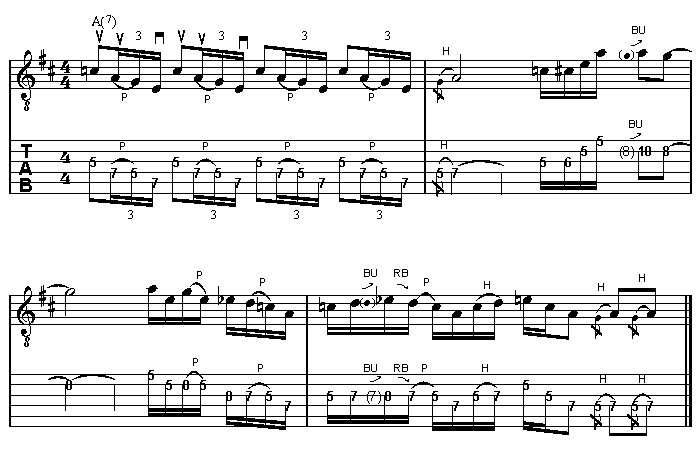 TIPP: In unserem Brian Setzer Workshop findest du einen Flash Film, der dir den eben beschriebenen Sachverhalt, auch optisch näher bringen kann. Klick hier Den Rest der Übung bestreitet Rob ausschließlich mit der puren Blues Scale. Besonders Aufmerksamkeit solltest du den gefühlvoll ausgeführten Bendings schenken. Die sind nämlich gar nicht so leicht zu meistern. Aber es lohnt sich! |