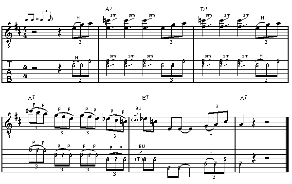 Ich denke du bist jetzt soweit, dass Ganze auch mal in der Praxis anzutesten. Zu diesem Zweck habe ich dir einen Lick herausgesucht, den der liebe Brian häufiger mal zum Besten gibt. Er besteht ausschließlich aus Tönen der A-dorischen Blues-Scale und featured, neben einigen Doublestops, einen für diese Tonleiter typischen Sechzehntel-Triolen Lauf. Damit du dich besser orientieren kannst, stellen wir dir den Lauf in zwei unterschiedlich schnell gespielten Versionen zur Verfügung. Bei Symptomen von Desorientiertheit empfehlen wir: Version 2-Die pure Slo Mo Variante Brian Berry alias Chuck Setzer