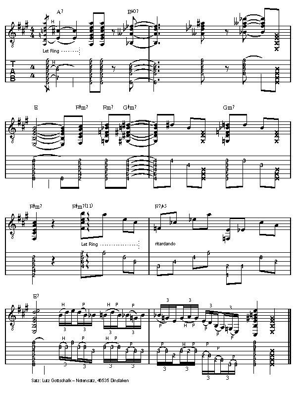 TIPP: Teste die Akkorde zunächst einmal einzeln an. Erst wenn du die verwendeten Voicings auswendig kennst macht es Sinn, dich an das Spiel der kompletten Nummer heranzumachen. In diesem Zusammenhang lege ich dir einmal mehr die Slo Mo Version der Nummer ans Herz. Sie kann dir, auf dem Weg hin zum perfekten Spiel der Akkord-Folge, eine große Hilfe sein. Viel Spaß beim Üben und denk dran: Es lohnt sich immer, während des täglichen "Surfs" einen Blick auf die Planet Guitar Web-Site zu werfen. Ständig neue Workshops und Interviews belohnen dich für dein Interesse an unserer Arbeiten. Bis bald ! < vorige Seite - zurück zum Anfang - planet-guitar Home