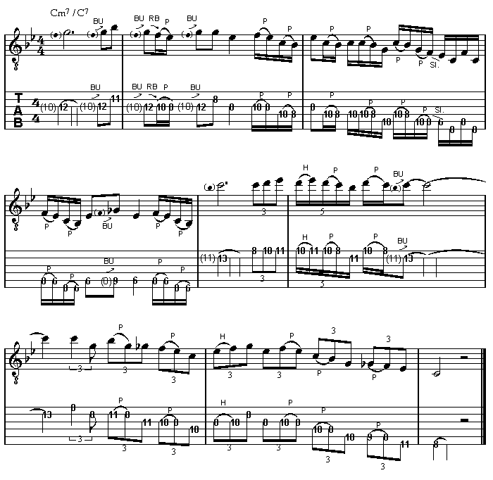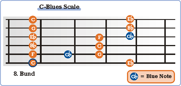 ÜBRIGENS: Auch Gitarristen wie Santana oder Steve Lukather sind Spezialisten im Umgang mit diesem Ton. In den Takten 5 und 6 unseres Beispiels zeigt Slash, dass auch er es versteht, die None in seinen Impros zum Einsatz zu bringen. Da dieser Teil des Solos recht schnell gespielt wird, lege ich dir noch einmal die Slo-Mo-Version des Tracks ans Herz. Den Rest des Beispiels bestreitet Kollege Hudson mit der C Blues Scale. Diese Skala erhältst du, indem du die bereits bekannte Moll Pentatonic, mit der Blue Note (Gb) ergänzt.