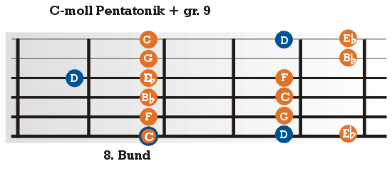 Der blau eingefärbte Ton in unserem Skalenbild bedarf einer besonderen Erklärung, denn er gehört nicht zum Standard-Outfit der Pentatonic Scale. Bei unserem Bläuling handelt es sich um die große None (gr.9/ D)), einem Intervall, das in Verbindung mit der Moll Pentatonic eine sehr gute Figur macht.