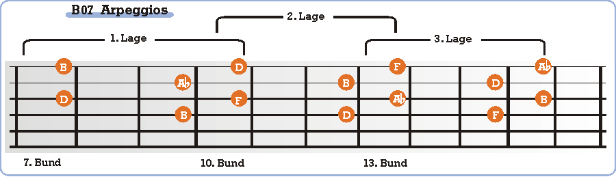 Wie du siehst, liefert uns das Bo7-Arpeggio viele der Töne, die auch im Bb7-Akkord enthalten sind. Einzig dass B(b9) fällt hier aus dem Rahmen. Und das ist auch gut so, denn dieses B'chen sorgt, im Zusammenklang mit dem Bb7-Akkord der Rhythmusgitarre, für die nötige Abwechslung. Doch das ist noch nicht alles. Das wirklich coole am Einsatz dieses Arpeggio-Typs ist, dass man mit ein und derselben Greifweise dieses Arps, das gesamte Griffbrett abdecken kann. |