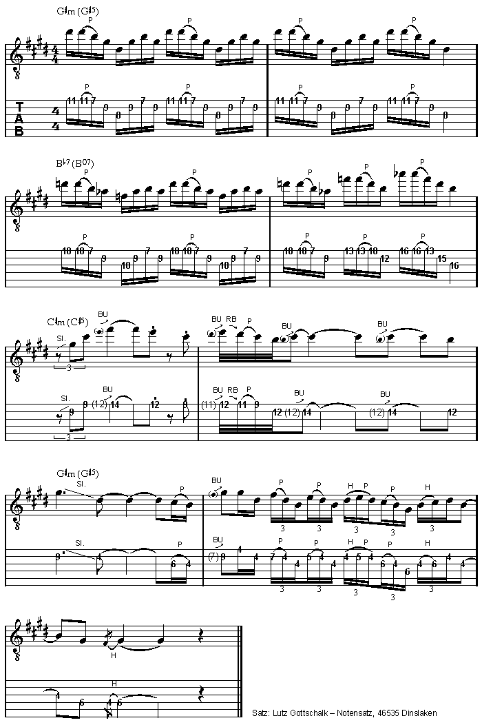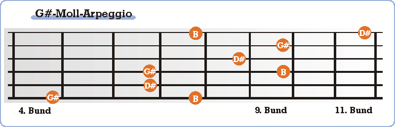 Das war ja noch leicht zu verstehen. Über einem G#-Moll-Akkord spielt man also ein entsprechendes G#-Moll-Arpeggio. Im Falle unseres zweiten Chords wird das Ganze leider etwas komplizierter. Über dem Bb7 verwendet Kollege Saul ein Bo7-Arpeggio (vermindert) . Keine Angst, auch hinter dieser Variante verbirgt sich kein großes Geheimnis; nur ein klitzekleiner Trick ! Zum besseren Verständniss schauen wir uns die beiden Akkorde/Arpeggien einmal unter dem Mikroskop an :