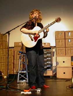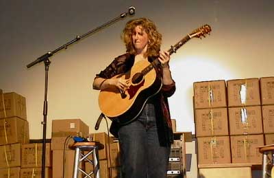 Als angenehmer Nebeneffekt des Engagements der Firma Gibson hatte man bei Vicki´s Gastspielen in Deutschland aber nicht nur die Möglichkeit gute Gitarrenmusik zu hören. Durch die Beteiligung von Gibson Master Luthier Ren Ferguson, konnten die Besucher auch jede Menge erstklassige Hintergrund-Informationen zu Gibson-Akustikgitarren mit nach Hause nehmen. Zur Unterstützung von Ren´s überaus interessantem Vortrag (O-Ton Ren: "I´m talkin, she´s playing") hatte der Music Store, gemeinsam mit Mitarbeitern des deutschen Gibson-Vertriebs M und T, in der Gitarrenabteilung eine breite Auswahl an Gibson-Akustikgitarren zusammengetragen - unter ihnen die edelsten Schmuckstücke. Eine beträchtliche Anzahl der hochdotierten Instrumente konzentrierte sich schließlich vor der Bühne. Wer allerdings dachte, dass Vicki bei ihrem Konzert verschiedene Modelle vorführen würde, sah sich getäuscht. Obwohl die Open-Tunings mit jedem Song wechselten, blieb sie ihrer Gibson L-140 treu (Das "L" steht bei den amerikanischen Traditionsbauern bekanntlich schon seit eh und je für eine Reihe von Gitarren mit kleinem Korpus. Für eine Frau, also das ideale Instrument).