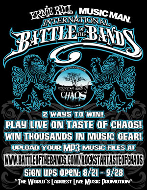 Die internationale Version des Wettbewerbs wird in Zusammenarbeit mit Rockstar Energy Drink und der Taste of Chaos Tour veranstaltet. Und mitmachen lohnt sich: Die Bands mit den meisten Plays erhalten wertvolle Sachpreise, gesponsort von bekannten Brands der Musikinstrumenten-Branche. Zusätzlich dazu bekommt eine, von einer Fach-Jury ausgewählte Combo die einmalige Chance, sich auf der Taste of Chaos Tour zu präsentieren. Die Tour zieht durch 30 Städte in 12 Ländern- darunter sechs Termine in Deutschland und einer in Österreich. Das Lineup besteht aus Acts wie Taking Back Sunday, Thursday, Anti-Flag, Underoath, Senses Fail, Alexisonfire, Saosin und vielen anderen. Die Teilnahme ist einfach: Einloggen, anmelden, mp3s, Fotos und eine Biographie hochladen. Die Anmeldung kann unter http://www.battleofthebands.com/rockstartasteofchaos bis zum 28. September 2006 erfolgen. Sign up today! |