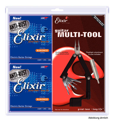 DiesesAngebot in 9er oder 10er Stärke gilt allerdings nur, so lange der Vorrat reicht. Elixir® Saiten mit der innovativen NANOWEB® Beschichtung und den neuentwickelten Anti-Rust Stahlsaiten bieten extrem lange einen brillanten Tonund klaren Klang. Deshalb wechseln Gitarristen, die Elixir® Saiten spielen,sehr selten. Wenn es dann allerdings doch einmal sein muss, dann hat diesesclevere Universalwerkzeug, das zusammengelegt in die Handfläche passt, allesan Bord, was man als Saitenkünstler so braucht: Zange, Seitenschneider,diverse Schraubenzieher, Saitenkurbel und sogar eine Taschenlampe. Für denkleinen Helfer findet sich überall ein Plätzchen - notfalls in der Hosentasche.