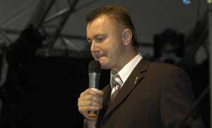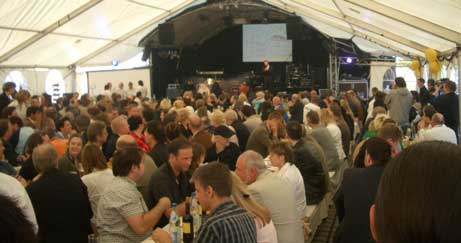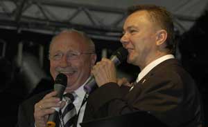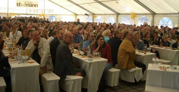 Das Jubiläumswochende startete am Samstag Nachmittag mit einem großen Sektempfang im eigens für das Jubiläum auf dem Treppendorfer Festplatz errichteten Großraum-Zelt. Ein Blick durch die Reihen der zirka 520 geladenen Gäste (plus 100 Thomann Mitarbeiter und Familienmitglieder) zeigte schnell: Hier war alles anwesend, was in der Szene Rang und Namen hat. So waren Produktmanager der großen Hersteller genauso selbstverständlich "an Bord", wie deren Chefs. Fachzeitschriften-Redakteure feierten in trauter Eintracht mit ihren Chefredakteuren. Nach dem Empfang folgte die Begrüßung der illustren Gemeinde durch den Chef des fränkischen Traditionsunternehmens, Hans Thomann.