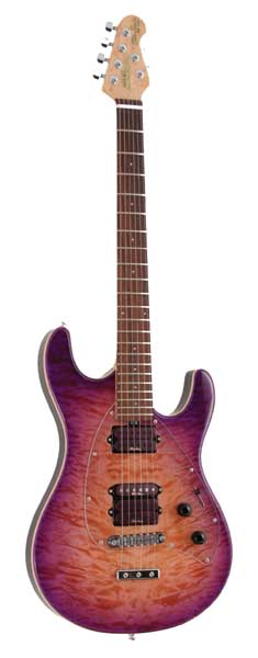 Um zu Beginn gleich mal ein Geheimnis zu lüften: Das Kürzel Y2d steht, passend zum gefeierten Jubiläum, für Year 2 Decades. Der Korpus der Neuen an Steve´s Seite (jetzt mit Binding) besteht aus Pappel, die mit einer Decke aus aufregend gemasertem Ahorn belegt wurde (geflammt, oder Quilted Maple). In Sachen Finishes sind neben einem wunderschönen Tabacco Sunburst zwei Lackierungen mit den vielsagenden Bezeichnungen Purple Sunset und De-Purple Burst am Start. Und damit man mit den exquisiten Decken und den neuen, transparenten Finishes auch so richtig protzen kann, hat MusicMan der Gitarre ein durchsichtiges Schlagbrett spendiert. Auch das Tonabnehmer Set-Up und die Controller haben eine Überarbeitung erfahren. Anders als beim Vorgänger- Modell in dem, neben je einem Humbucker in der Bridge- undNeckposition gleich zwei Single-Coils auf Beute lauern, hat man sich dazu entschlossen den Platz in der Mittelposition des Jubiläums- Modells mit einem einzelnen, neu entwickelten DiMarzio Single- Coil zu füllen. Bridge - und Neckposition bleiben aber auch bei der Y2d die Domäne von je einem DiMarzio Humbucker. Kontrolliert werden die drei Spezialisten über einen 5-Wege Pickup Wahlschalter. Die Y2d ist wahlweise in einer Version mit feststehender Music Man Standard Bridge, oder einem Floyd Rose Tremolo- System erhältlich.