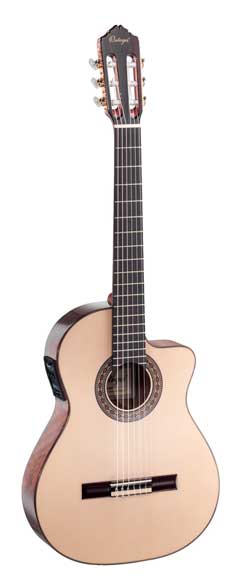 Mit der RCE280T stellt Ortega seine erste Thinline- Konzertgitarre vor. Der Korpus der RCE280T hat eine Tiefe von schlanken 7cm und ist, dank Cutaway, auch in höheren Lagen hervorragend bespielbar. Boden & Zargen der wunderschönen Gitarre, sind aus Ovangkol, die Decke aus massiver Fichte gefertigt. Trotz des verringerten Resonanzraum bietet die Thinline einen sehr ausgewogenen Klang, bei geringster Feedback-Anfälligkeit. Als Tonabnehmer kommt eine Piezo-Variante, in Verbindung mit der bewerten Fishman-Classic-4-Elektronik zum Einsatz.