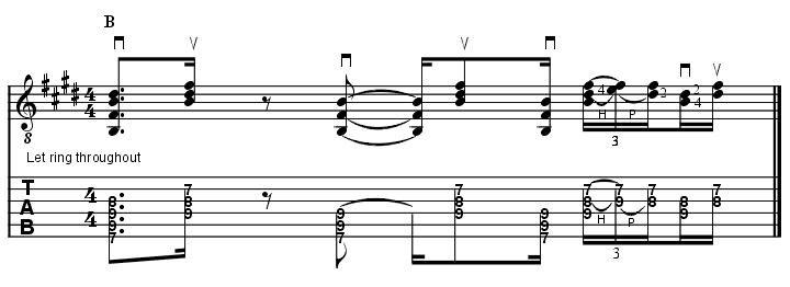 | Seite 14: Die volle FortsetzungDem Flash-Movie auf der vorangegangenen Seite konntest du entnehmen, dass ich mir den vierten Finger ausleihe, um mit seiner Hilfe für die nötige soundmäßige Abwechslung zu sorgen. Schauen wir uns gleich einmal an, wie so etwas in freier Wildbahn funktionieren kann. Übrigens: Lerne den folgenden Lick sehr gewissenhaft, denn er wird in unserem Anwendungsbeispiel "Green Chili Pie" auf der nächsten Seite, noch eine tragende Rolle übernehmen. Four For Sale (Audio Media button 1 - Video Media button 2)   Home - Kursindex - 1 Seite zurück - 1 Seite vor - Glossar - FAQ - Help |