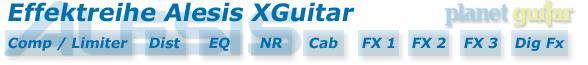 Der KorpusDenkt man sich die DSP- Innereien einmal weg, ist die X-Guitar eine ganz normale E-Gitarre im klassischen Double-Cutaway Design. Der deckend schwarz lackierte Korpus besteht aus Erle. Das Tonholz ist im E-Gitarrenbau sehr beliebt und liefert einen obertonreichen, mittenbetonten Sound. In Sachen Tonabnehmerbestückung setzt Alesis bei der XGuitar auf die stilistisch flexible S/S/H Konfiguration. Dabei sind die beiden Single-Coils und der Humbucker, genau wie der Volume-Regler, der Pickup-Wahlschalter und die Effekt On/Off -, und Programm-Wahlschalter, auf einem einschichtigen weißen Pick-Guard untergebracht. Die vintagestyle Tremolobridge wurde von Werk ab aufliegend eingestellt, eine Herangehensweise, die einen stimmstabilen Betrieb gewährleistet. Auch ein Saitenriss, oder das Herunterstimmen einer Saite zieht in dieser Einstellung keine unmittelbaren Nachstimmarbeiten bzw. den direkten Spielabbruch nach sich. Die Qualität der Hardware geht in Ordnung. Alle standardmäßig nötig werdenden Einstellarbeiten (Intonation, Saitenlage) lassen sich schnell und präzise erledigen. Der Tremoloarm wird geschraubt. Wegen des recht starken Federzugs gestaltet sich das eigentliche "Vibrieren" relativ stramm, in Sachen Stimmstabilität macht das System allerdings einen guten Job. Auf der Rückseite der Gitarre findet sich, neben der Abdeckung für die Federkammer, das Batteriefach der integrierten DSP-Sektion. Mit vier Batterien der Größe AAA lässt sich die Gitarre laut Herstellerangaben bis zu 30 Stunden betreiben. Alternativ dazu ist aber auch die Befeuerung mit einem optionalen Netzteil möglich. Im "passiven" Betrieb arbeitet die Xguitar wie eine normale E-Gitarre. Der HalsDer einteilige, über vier Bolzenschrauben sicher mit dem Korpus verbundene Hals, besteht aus Ahorn. Das Palisander-Griffbrett (648mm Mensur) wird durch 22 sauber eingesetzte und abgerichtete Mediumjumbo Bünde unterteilt. Klassisch schlichte Dot-Inlays in Griffbrett und Sichtkante markieren die relevanten Lagen. Das gewählte Hals-Shaping ist relativ flach und liegt gut in der Hand. In Sachen Headstock-Design geht Alesis bei der X-Guitar eigene Wege. Na, nicht so ganz! Irgendwie ähnelt das Shaping der Kopfplatte einer Gibson Firebird- "in richtig rum" der auf der Mechanikseite ein schmissiger Einschnitt verpasst wurde. In Sachen Mechaniken setzt Alesis auf die geschlossene Variante. Die sechs Tuner arbeiten präzise und leichtgängig und sorgen so für einen stimmungsvollen Betrieb. Die Fräsung für die Halsstellschraube bleibt bei der X-Guitar unbedeckt. Die ElektronikAls klassischer Wolf im Schafspelz kommt die XGuitar in Sachen Elektronik natürlich nicht mit den üblichen Standards aus. Und so findet man, neben den eben schon erwähnten Reglern auf dem Schlagbrett, ein in den oberen Cutaway eingelassenes Bedien-Panel zur Kontrolle der integrierten DSP-Sektion. Womit wir beim Thema wären. Parallel zur Funktionsweise als normale E-Gitarre, bietet die XGuitar nämlich die Möglichkeit auf ein üppiges Angebot an Effekten zurückgreifen zu können. Dabei stehen klassische Vertretern der "Modulations-, und Ambience-Szene", sowie diverse Distortioneffekte und Cabinet-Simulationen zur Verfügung. Die einzelnen Effektmodule werden in sieben logischen Signalketten verwaltet, die sich, je nach Anwendungsgebiet, frei anwählen lassen. In der Basis-Konfiguration sieht die Abfolge so aus: