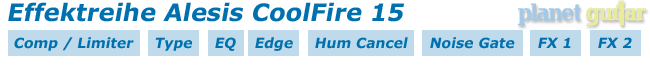 KonzeptMit dem Coolfire 15 wendet sich Alesis an all jene Gitarristen, die ihre tonabnehmerbestückten Akustik-Gitarren ohne den Einsatz komplexer Set-Ups verstärken und mit amtlichen Effekten versorgen wollen. Und was braucht der Akustiker zu seinem Glück? Eine speziell auf das Einsatzgebiet abgestimmte Verstärkersektion, einen entsprechenden Speaker und - am besten - einen Hochtöner zur optimalen Übertragung der für einen perfekten Akustik-Sound so wichtigen Brillanzen. In dieser Hinsicht haben die Alesis Designer ganze Arbeit geleistet und dem Coolfire, trotz seiner extrem transportfreundlichen Abmessungen, alles mit auf den Weg gegeben was nötig ist um eine amtliche Akustik-Performance abzuliefern. So ist der Amp mit einem 2-Wege Speaker-System ausgestattet, dass aus einem 8" Basslautsprecher und einem 1" Tweeter besteht und so in der Lage ist die von der Verstärkersektion gelieferten Sounds standesgemäß an die Luft zu setzen. Parallel dazu spendierte Alesis dem Coolfire eine komplett ausgestattete Stereo-Effektsektion, inklusive der Möglichkeit des Instrumenten-Modelings. Im Detail versorgt die DSP Abteilung mit mehr als 20 Effektypen, darunter Standards wie diverse Reverb, Delay und Modulationseffekte, aber auch wichtige Tools wie einen Kompressor/Limiter, ein Noise Gate/Hum Canceling sowie die eben schon erwähnten digital nachgestellten Gitarren-Modelle. Verarbeitung und DetailsBevor wir uns auf die Bedienmatrix des Coolfires stürzen wollen wir zunächst einmal einen Blick auf die "Hardware" werfen. Der Amp folgt dem klassischen Combo-Prinzip und macht qualitativ nicht nur auf den ersten Blick einen sehr guten Eindruck. Das Gehäuse des kompakten Akustik-Spezialisten besteht aus robustem MDF und ist mit strapazierfähigem braunen Kunstleder bezogen, dass in Sachen Optik und "Anmutung" sehr realistisch rüberkommt. Die so erreichte Wertigkeit wird durch die verbauten Metall-Protektoren zum Schutz der Gehäuseecken noch unterstrichen. Auch die gewählte Lautsprecherbespannung passt optisch perfekt ins Bild. Ein Alesis-Logo im rechten unteren Bereich des Speakerfelds gibt Auskunft über die Familienzugehörigkeit des kleinen Riesen. In Sachen Design hat das Alesis-Team auch beim Bedienpanel ganze Arbeit geleistet. Das Panel kombiniert sehr geschmackvoll klassische und moderne Elementen und passt perfekt zum übrigen Outfit des Amps. Bedienung und mehrWenn man sich das Bedienpanel des Amps genauer anschaut fällt auf, dass bis auf den Master-Volume-Regler zur Kontrolle der Gesamtlautstärke, keine unmittelbar auf typische Amp-Funktionen zugreifenden Regelinstanzen zur Verfügung stehen. So sucht man beim Coolfire 15 zum Beispiel eine Klangregelung zunächst vergebens. Aber keine Sorge. Natürlich verfügt der Amp über einen EQ! Allerdings hat sich Alesis bei der Konzeption des Verstärkers dazu entschlossen die Klangregelung nicht über separate Regler direkt "anwählbar" zu machen, sondern die einzelnen Frequenzbänder über den für die Effektsektion zuständigen Effekt-Regler, in Kombination mit dem zugeordneten Value-Regler anzupassen. Da das ganze aber praxisgerecht gelöst wurde sind auch schnelle Veränderungen des Amp-Sounds z.B. während eines Gigs, ohne nervendes Gefummel möglich. Um die Bedienphilosophie des Coolfires besser verstehen zu können, wollen wir uns die zugrunde liegende Struktur jetzt einmal etwas genauer anschauen: Die zur Verfügung stehenden Effekte und Tools reihen sich in einer Kette aneinander und können über den Effekt-Regler separat angewählt und editiert werden.