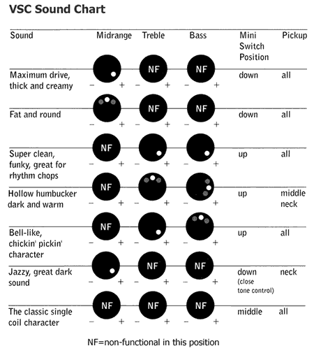 Besonderes Interesse weckt der unscheinbare Minischalter. Er ist das sichtbare Zeichen eines ganz speziellen Features der Texas Serie: Des VSC Preamp. Der zuschaltbare Preamp wird von einer 9V Blockbatterie gespeist und mit Hilfe des angesprochenen Mini-Switches (On/Off/On) scharfgeschaltet. Der Preamp bietet die Möglichkeit die drei Basis-Frequenzbänder Bass, Mitten, Höhen um bis zu 6 dB zu boosten- sie also zu verstärken. Anhand des bereits beschriebenen Bedienpanels auf der Rückseite der Blade, lassen sich die Verstärkungsfaktoren der 3 Bänder unabhängig voneinander regeln. Diese Maßnahme versetzt den User in die Lage, die unterschiedlichsten Klangvorstellungen zu realisieren und so die Flexibilität des Instruments spürbar zu erhöhen. Fristeten boosterbestückte Gitarren in der Vergangenheit eher ein Schattendasein, scheint das Konzept Gary Levinsons tatsächlich aufzugehen. Der Preamp ist eine Zugabe, die man optional zum Einsatz bringen kann. Bei ausgeschaltetem VSC Booster (und auch bei leerer Batterie) bietet die Texas alle Vorzüge einer "normalen" Gitarre. Aktiviert man den Preamp, so kann man umgehend auf die unterschiedlichsten Preset Sounds zurückgreifen. Und die können auch schon mal eine Spur krasser ausfallen. Nach getaner Arbeit schaltet man wieder auf Passiv-Betrieb und schon bedient die Axt wieder auf gewohnt klassische Weise. Dabei ist das Schaltungs-Layout so ausgelegt, dass es gleich zwei unterschiedlich voreingestellte Preseteinstellungen zur Verfügung stellt. In der Up-Position des Mini-Switches (Schalter nach oben), lässt sich ausschließlich das Bass- und Höhen- Band beeinflussen. Schaltet man in die Down-Position, so wird das Mitten-Band aktiv. Auf diese Weise lassen sich -unabhängig voneinander- jeweils zwei sehr unterschiedliche Preset-Sounds einstellen und bei Bedarf per Mini-Switch-Klick abrufen. Hier ein kleine Auswahl der möglichen Klangcharakteristika: