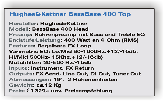 Bassanlage: Hughes & Kettner Bass Base 400 -Bass und BässerTopteil: Bass Base 400 Boxen: BR115H und BR410H ein Test von Oliver Poschmann Vor einiger Zeit besuchte ich ein Konzert des Father of Funk Bass Larry Graham and the Graham Central Station. Ort des Geschehens war ein mittelgroßer Club mit einem Fassungsvermögen von ca. 800 Leuten. Auf der Bühne warteten zwei Hughes & Kettner Bass Base 600 Stacks mit Bass Custom Boxen auf die Ankunft des Meister. Das was dann folgte, konnte man wahrscheinlich am ehesten als waschechtes Bassgewitter bezeichnen. Larrys Sound war so fett, das er wohl jeden der Anwesenden (geschätzter Bassistenanteil ca. 60%) in Verzückung versetzte. Zwar hörte man kaum noch was vom Rest der Band, aber umso deutlicher wurde klar: Mit diesem Equipment macht man keine Scherze! Hughes & Kettner ist in der Bass-Welt eine nicht mehr wegzudenkende Größe. So wundert es sicher auch niemanden, dass auch verwöhnte Profis wie Scorpions Bassist Ralf Rieckermann, die Latenight Spezialisten Klaus Fischer (TV Total) und Roscoe Gee (Dirty Harry), Basslegende Bootsie Collins oder Fusion Ass Jeff Berlin voller Begeisterung auf Equipment aus dem Hause Hughes&Kettner zurückgreifen. Und auch ich bekam die Zuverlässigkeit und Klangqualität von Hughes & Kettner Anlagen während meiner zweiten Rödelheim Hartreim Tournee 1996 unter Beweis gestellt. Stilistische Bandbreite wird also bei H&K mitgekauft. Konzept und KonstrunktionDie hier vorgestellte kleinere Geschwisteranlage Bass Base 400 (in Kombination mit den Bass Regular Boxen(BR)), ist mit ihren 400 Watt an 4 Ohm, eine zwar leistungsschwächere Version der gerade beschriebenen Monsteranlage, bietet jedoch nicht minder attraktive Features für Studio und Bühne. Genau wie sein großer Bruder (BB600) verknüpft auch das Bass Base 400 Top eine wohlklingende Röhrenvorstufe mit zuverlässiger, gewichtreduzierender und wartungsfreier Transistor-Endstufentechnologie. In punkto Leistung sei gesagt: Wer von seinen Bandkollegen nicht sofort massakriert werden möchte, der sollte auch bei dieser Anlage den Gain Regler im Auge behalten....
