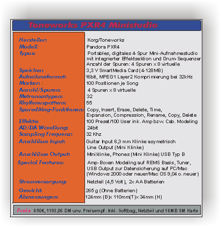 4-Spur Mini Recording Studio-Cooles Upgrade der Büchse der PandoraWer weiß schon genau wieviele der größten Melodien der Pop-History vom jeweiligen Komponisten spontan und an allen möglichen und unmöglichen Orten in ein rudimentär ausgestattetes Diktiergerät gehaucht wurden?! Will man den bereitwilligen Angaben der jeweiligen Protagonisten glauben, sind es zumindest jede Menge! Legende hin, Legende her. Tatsache ist, dass die fortschreitende Miniaturisierung komplexer Schaltungen ab sofort dafür sorgt, dass jeder -mehr oder weniger- kreative Geistesblitz nicht nur in seiner simpelsten Form konserviert werden kann, sondern auch am Strand, im Tourbus oder Backstage, in einer nahezu entgültigen Form seine Verewigung finden kann. Die neueste Errungenschaft im All-In-One Mini-Recording Business ist das Toneworks Pandora PXR4, dass neben legendären Pandora Standards wie coolen REMS Amp-Sounds und integrierten Drum-Grooves, eine komplett ausgestattete Recording-Sektion bietet die es ermöglicht, allerorts zum großen Aufnehmen ausholen zu können. Das KonzeptBasisinfos Das PXR4 folgt dem Konzept eines digitalen Aufnahmestudios. Neben einer komplett ausgestatteten 4-Spur Recording Sektion (plus 8 virtuelle Spuren pro Track), liefert die integrierte Effektabteilung alles was nötigt ist, um ausgefeilte Aufnahmesessions fahren zu können. Der Anwendungsbereich wurde dabei grundsätzlich breiter angelegt, als bei den beiden -speziell für den Einsatz mit Bass oder Gitarre konzipierten- Pandora Basismodellen. Trotz einer Vielzahl hervorragender REMS gestützter Gitarrenamp- und Cabinet-Simulationen, sind die werksseitig angelieferten Presets von den Toneworks-Machern so designed und gruppiert worden, dass man alle Arten von Instrumenten aufnehmen und mit perfekt abgestimmten Effektsounds belegen kann. Um auch akustische Signale problemlos auf die Karte zu bekommen, wurde das PXR4 zusätzlich mit einem integrierten Mikrophone ausgerüstet. Für den nötigen Groove sorgen 55 Drum Groove plus 32 Metronom Sounds inklusive diverser Odd Times. werksseitig programmierte Drum-Pattern. Die Datenspeicherung erfolgt auf einer Smart Media Cart. Die Details