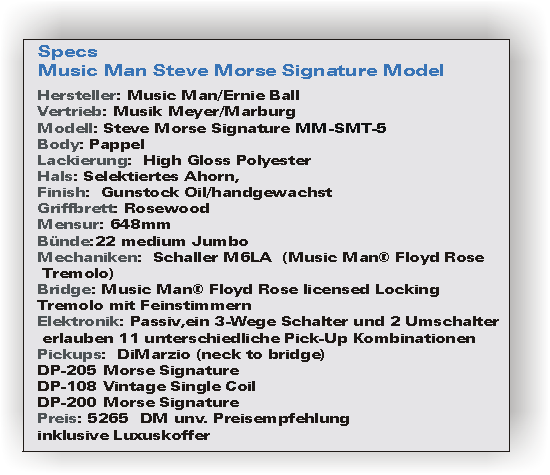 Test- Music Man Steve Morse Signature Modellvon Hansi Tietgen Der Einstieg bei den Kult-Hardrockern Deep Purple erhöhte den Bekanntheitsgrad des Gitarristen Steve Morse enorm. Doch Kenner der Szene wissen: Schon in den siebziger und achziger Jahren verzückte der Ausnahmegitarrero die Fans mit seiner schier unglaublichen Fingerakroatik und Energie. Seine Arbeit mit den Dixie Dregs ist legendär und auch Steves diverse Soloalben sollten zum Bestand jeder gut sortierten (Rock-)Plattensammlung gehören. Stilistisch liess Mr. Morse sich eigentlich nie wirklich festlegen. Er ist einer der vielseitigsten Gitarristen der Welt. Und so wundert es sicher niemanden das ein Gitarrist von seinem Kaliber auch ein ihm ebenbürtiges Instrument benötigt. Um seine Ansprüche an ein Instrument zu befriedigen, konnte es nur einen Weg geben: Ein Signature Modell musste her; genau auf ihn abgestimmt, aus edelsten Zutaten gefertigt, ausgestattet mit einem enormem Soundspektrum und einer hervorragenden Bespielbarkeit. Kontakte führten den Ausnahmegitarrero zu den Spezialisten der kalifornischen Instrumentenschmiede Ernie Ball/Music Man. Die Zusammenarbeit brachte eines der flexibelsten Gitarrenkonzepte hervor, das die Welt je gesehen hat: das uns zum Test vorliegende Music Man Steve Morse Signature Modell. KK-Korpus und KonzeptFür den Korpus der Steve Morse Gitarre stand ein Klassiker der Music Man Range Pate: Die Silhouette. Eine Gitarre also, bei deren Design sich die Konstrukteure im Groben an der Formgebung der guten, alten Fender Strat orientiert haben. Herausgearbeitet wurden diese mehr als nur vertraut anmutenden Kurven aus einem gut abgelagerten Stück Pappel, einem Holz also, das mit hervorragenden Klangeigenschaften aufwarten kann. Den nötigen Schutz erhält der Edelkörper der "Steve Morse" durch eine bewährte Lackierung auf Polyester Basis, die im Falle des uns vorliegenden Testmodells, tiefschwarz und hochglänzend ausfällt- perfekt! Verziert wird der Korpus durch ein dreischichtiges schwarz-weiss-scharzes Schlagbrett, auf dem auch die Tonabnehmer-Armada (DiMarzios) und die diversen Regler und Umschalter ihren Platz gefunden haben- dazu aber später mehr. Ein weiterer Hingucker ist das hochwertige Floyd Rose Tremolo in Chrom-Optik, das von Music Man hauseigen in Lizenz gebaut wird. Da die Elektronik der Gitarre unter dem Schlagbrett angebracht ist, findet man auf der Rückseite der Gitarre lediglich die Abdeckung für die Federkammer. Der HalsDer Hals besteht- musicmantypisch- aus einem handverlesenen Stück Ahorn, das den Betrachter mit seiner sehr schönen Maserung betört. In Sachen Oberflächenveredelung setzte man -einmal mehr- auf Wachsen und Ölen, eine Massnahme, die ein sehr angenehmes Spielgefühl und eine ganz spezielle Griffigkeit garantiert. Der Hals liegt satt in der Hand und erinnert in seinem Shaping an alte Strats. Die 22 Medium-Jumbo Frets sind perfekt im aus Palisander gefertigten Griffbrett versenkt und abgerichtet worden. Zierliche Dot-Inlays auf und seitlich des Griffbretts markieren die wichtigsten Lagen und sorgen so für die nötige Orientierung. Die Halsbefestigung erfolgt -stabil und sicher- durch 5-Bolzen, die in einer verchromten Metallplatte halt finden. Verziert wird diese von einem eingravierten Firmenlogo plus Seriennummer. Das Kopfplatten-Design der Instrumente der Ernie Ball/Music Man Range hat mittlerweile sicher denselben Wiedererkennungswert wie das der beiden anderen grossen amerikanischen Traditionsmarken. Die eher zierlichen Ausmasse und die unsymetrische Anordnung der Mechaniken sind echte Music Man Trademarks geworden. Im Falle unserer Morse Signature findet man auf der klar lackierten Kopfplatte sechs wertvolle, verchromte Schaller M6LA Mechaniken. Das Music Man/Ernie Ball Logo und der Steve Morse Signature Schriftzug sorgen für die nötige Markeninfo. Abgerundet wird das Ganze vom floydrosetypischen Locking Nut, einem Sattel also, bei dem die Saiten mit Hilfe von 3 Metallplatten plus Imbusschraube, paarweise arretiert werden können, um so einen verstimmungsfreien Betrieb des Tremolos zu gewährleisten. Die ElektronikAuch die Schaltung und Tonabnehmer-Bestückung der Gitarre wurde speziell auf Steve's Bedürfnisse abgestimmt. Fangen wir mit den Standard-Infos an: Die Elektronik ist passiv. Geregelt werden: 1x Volumen und 1x Tone. Das war schon alles "Normale". Die Steve Morse ist mit vier(!) DiMarzio Pick-Ups ausgestattet, die speziell für Steve ent-"wickelt" wurden. Hier die genauen Typen-Bezeichnungen (vom Hals zur Bridge):