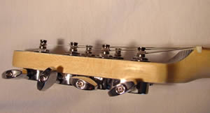 Der HalsDas Shaping des einteiligen Ahornhalses liegt angenehm in der Hand und garantiert so eine sehr gute Bespielbarkeit. Auch das mit 22 sauber eingesetzten und abgerichteten medium Size Jumbo Frets ausgestattete Griffbrett wurde aus Ahorn gefertigt. Für den nötigen optischen Kontrast und eine optimale Orientierung sorgen zierliche schwarze Dot-Inlays in Fläche und Flanke. Die Halsbefestigung erfolgt -musicman-typisch- durch eine Vierpunkt-Verschraubung. Die leicht abgeschrägte Formgebung des Hals-Korpus Übergangs, erlaubt das komfortable Bespielen der hohen Lagen. Die verchromte Halsplatte folgt in ihrer Formgebung der Schräge und wird von einem geprägten OLP Logo verziert (siehe Foto im PG Gear Check). Als legitimierter Ernie Ball Ableger nutzt OLP das gleiche Kopfplatten-Design,