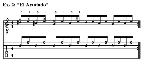 Der Daumen (p) spielt die Melodie im "Beatfeeling" auf der B-Saite. Mit dem Zeigefinger (i) wird im Off-Beatfeeling auf der leeren dünnen E-Saite ein Orgelpunkt dagegengehalten, der die mit dem Daumen gespielte Melodie harmonisch stabilisiert. "P" und "i" verrichten gleichmäßige, fast monotone Bewegungen und üben alles in allem einen rhythmisch eher "unspektakulären" Job aus. Alle gespielten Töne überlappen wie bei einem bunten Aquarell. Im Notentext wir dies durch den Zusatz "let ring" gekennzeichnet. Die beschriebene Technik wurde vor allem von spanischen Gitarristen kultiviert. Viele spanische Gitarrenstücke (z.B. "Asturias", "Malaguena") basieren auf der Spielweise, die man "passenderweise" gelegentlich auch als ayudado p-i bezeichnet. TIPP: Du solltest mit der rechten Hand die "klassische Haltung" einnehmen. Dabei ist der Daumen (P) von den anderen Fingern weiter abgewandt, so dass der Daumennagel parallel zu den Saiten verläuft und die Finger in die Handfläche zeigen. Die Finger schlagen die Saiten parallel zum Steg an. Achte bitte darauf das sich "P" und "i" bei entgegengesetzter Anschlagbewegung nicht berühren oder sich in ihrer Bewegungsfreiheit einschränken. Beginne Ex. 2 zunächst ganz langsam und versuche erst wenn sich Spielroutine einstellt auf Tempo zu gehen. |