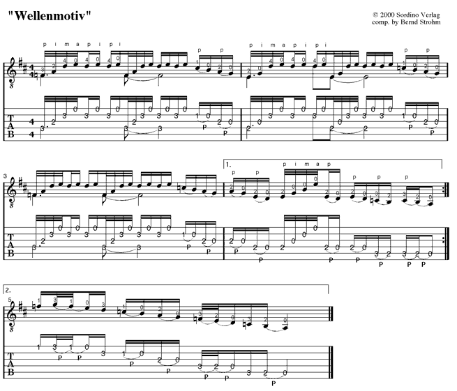 Respighi und Debussy waren die ersten, die in ihren Kompositionen eindrucksvoll zeigten, dass sich Naturereignisse wie Wasser- oder Wellenbewegung auch musikalisch umsetzen lassen. Auch mein Stück "Strohmaufwärts" soll mit den Möglichkeiten der akustischen Gitarre ähnliche Impressionen vermitteln. Den kompletten Song findest du auf meiner gleichnamigen CD. Eine gekürzte Version zur Unterstützung der nachfolgenden Analyse haben wir dir zum Download vorbereitet. Nach 29 Sekunden wird das besagte "Wellenmotiv" erreicht. Höre dir die folgende Passage erst mal an !