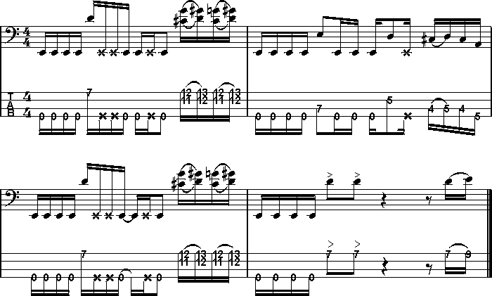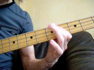 In SlapHop verwende ich auf der 1 jeweils einen vierfach-sechzehntel Slap. Das ist anfangs etwas gewöhnungsbedürftig, da der Daumen hier vier gleichmäßige Sechzehntel hintereinander slappen muß. Im Normalfall sind es ja selten mehr als zwei Slaps, die aufeinander folgen. Leider gibt es hier keinen geheimen Tipp zu verraten. Es ist reine Übungssache! Fange langsam an und steigere mit wachsender Sicherheit kontinuierlich das Tempo. Nach einiger Zeit erreichst du den Punkt, an dem du in der Lage bist, die vier Slaps so regelmäßig wie eine Maschine hintereinander weg zu spielen. Du kannst die dafür notwendige Handbewegung auch trocken, ohne Bass üben. Da es sich um ein rein motorisches Training handelt, braucht man dazu lediglich ein Objekt, auf das der Daumen hämmern soll, z. B. Brustkorb, Unterarm, Oberschenkel, Tischplatte, etc..
