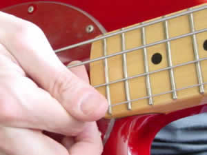 Zurück zum Stück! Der 2te Takt ist etwas kniffelig, da hier Pulls auf der A-Saite stattfinden. Es ist nicht so einfach die A-Saite mit dem Zeige- oder Mittelfinger anzureißen, da es a) ungewohnt ist und b) weniger Platz zur Verfügung steht, um mit dem Finger unter die Saite zu kommen, als z.B. bei der freiliegenden G-Saite. (Foto)