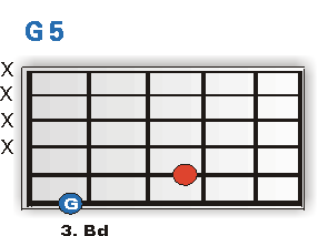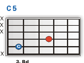 Der jeweilige Grundton der beiden vorgestellten Powerchords liegt auf der tiefen E-, bzw. A-Saite (blau eingefärbt). Und genau diese Töne sind es, die jedem einzelnen Akkord seinen Namen verleihen. Spiele ich den Griff mit dem Grundton auf der E-Saite im 3.Bd,wird der Akkord zum G-Powerchord (E-Saite 3.Bund=G), schiebe ich ihn in den 1. Bund so erklingt ein F 5(E-Saite 1.Bund=F). Genauso verhält es sich natürlich auch mit der "A" Variante. Im 3. Bd gespielt erklingt ein C5er (A-Saite 3. Bund=C), versetzt man den Griff in Bund Numero 5, so erhält man einen waschechten D5er.