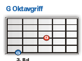 Der Oktavgriff kann dir als eine Art "Eselsbrücke" dienen, um die Töne der D-Saite von deinen bereits vorhandenen Kenntnisse der Noten auf der E-Saite abzuleiten. Grundsätzlich kann man sagen, das die Noten auf der D-Saite- in Relation zu denen auf der E-String- um genau zwei Bünde nach oben verschoben zu liegen kommen. So findet sich der Ton G im 3.Bund der E-Saite, zum Beispiel auch auf der D-Saite im 5. Bund. Und das war es schon! Alle anderen Noten kannst du dir auf die gleiche Weise ableiten und bist somit in der Lage auch den Powerchord mit dem Grundton auf der D-Saite zu managen.