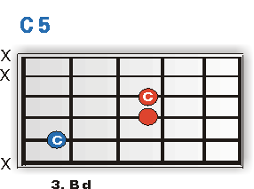 Aber Achtung! Die Grundtöne liegen bei den beiden Powerchord-Varianten an ungewohnter Stelle. In Version A stellt das Ganze eigentlich kein Problem dar, da der Grundton hier auf der hohen E-Saite zu finden ist. Man muß also lediglich die neu erworbenen Kenntnisse über die Töne auf der tiefen E-Saite auf den hohen Schwesterdraht übertragen. Bei der zweiten Greifweise kann ein kleiner Trick weiterhelfen. Der Grundton dieser Variante findet sich auf der D-Saite. Jetzt könnte ich dir anraten einfach auch noch die Töne auf der D-Saite auswendig zu lernen. Sicher nicht das Schlechteste. Aber es geht auch schneller. Schau dir doch mal das folgende Griffbild an: