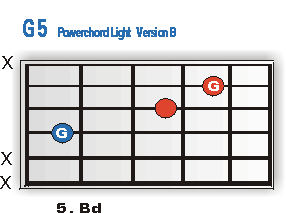 PG Chord Zone Part 6 Seite 3Neben der eben vorgestellten Basis-Version, erfreut sich in informierten Rocker-Kreisen, eine um einen Ton verfettete Powerchord-Greifweise einer besonderen Beliebtheit. Aber keine Sorge: Der Ton ist nicht wirklich neu- es handelt sich bei ihm lediglich um eine oktavierte Ausgabe des Grundtons.