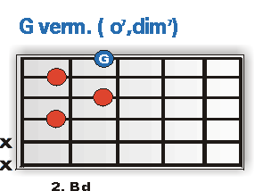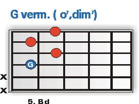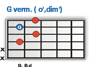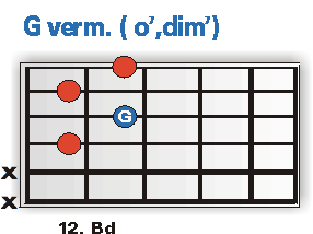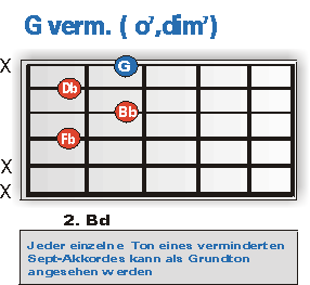 Demzufolge ist der oben abgebildete Griff, neben seiner Haupttätigkeit als G verminderter Septakkord, auch als Bb o7, Db o7 und Fb o7 einsetzbar. Das Kürzel"o7" ist übrigens eine weit verbreitete Schreibweise für den Akord-Typus verminderter Septakkord. Andere Schreibweisen sind: dim7 oder diminished7. Aber die symmetrische Struktur von verminderten Septakkorden, bringt noch einen weiteren Vorteil mit sich: Im o7 Business ist es möglich, das gesamte Griffbrett der Gitarre mit nur einer einzigen Greifweise zu erobern. Dabei beträgt der Abstand zwischen den einzelnen Stationen - der Akkord-Struktur entsprechend- jeweils drei Bünde (ein kl.3 Intervall).