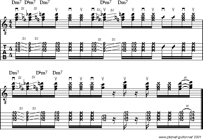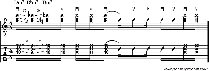 Let's Get Funky- Funk Guitar Workout Seite 4Eine weitere Technik mit der man Akkorden den nötigen Funky Touch besorgen kann, ist das Sliding. Im Allgemeinen nutzt man die Technik dazu, um Akkorde chromatisch zu umspielen. Das ist zwar nicht ganz einfach zu managen, macht aber richtig was her. Üben lohnt sich also doch! Hier eine erste Basisversorgung in Sachen Funky Slides: Basisübung Sliding