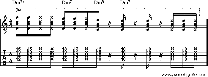 Part 2 knüpft thematisch selbstverständlich genau da an, wo wir im ersten Teil unseres Funk Workouts aufgehört haben. Die Basis Moll7 Akkorde hast du -fleißig wie du bist- ja sicher schon gelernt. In der heutigen Workshop Ausgabe will ich dir zeigen, wie du diese Chords, durch das Hinzufügen von Klangfarben, den sogenannten Optionen, soundmäßig weiter aufpeppen kannst. Unser erstes Beispiel featured gleich zwei unterschiedliche "Soundverbesserer"- die große 9 (E) und die reine 11 (G). Gimme More hören