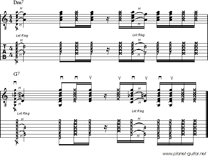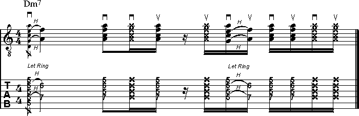 Das Pattern startet mit einem puren Barré Griff im 5.Bund. Das unmittelbar nachfolgende Hammering macht den Griff zu einem ganz normalen Dm7 Akkord. Im Verlauf des Lix wiederhole ich diese Aktion noch einmal, füge ein paar Scratches ein und -fertig ist die Laube. ÜBRIGENS: Die im unteren Bereich durchgestrichene erste Note, nennt man Vorschlag. Sie hat keinen rhythmischen Wert und dient einzig und alleine dazu, das nachfolgende Hammering möglich zu machen. Die zweite Hammering Aktion auf der 3+ des Patterns geht von einer normalen 16tel Note aus. Der pure Barre´Griff muß in diesem Fall also eine Spur länger ausgehalten werden! Also: Aufgepaßt! Weiter geht's. Im allgemeinen möchte man es im Winter ja recht mollig haben. Trotz dieses Bedürfnisses möchte ich dir im nächsten Pattern zeigen, dass man auch Dur Akkorde mit der Hammering Technik ziemlich gewinnbringend aufmöbeln kann. Die Rhythmik der beiden Takte ist dabei absolut identisch. 7 Plus! hören