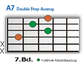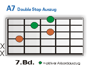 Das dem Riff zugrundeliegende Wirkprinzip ist ziemlich simpel. Um an die begehrten Double Stops zu kommen, zerlege ich die zu Beginn vorgestellten 7er Griffbilder in entsprechende Kleinstsegmente. Zur optischen Unterstützung des Sachverhalts haben wir dir einige unserer bewährten Akkord Abbildungen anzubieten.