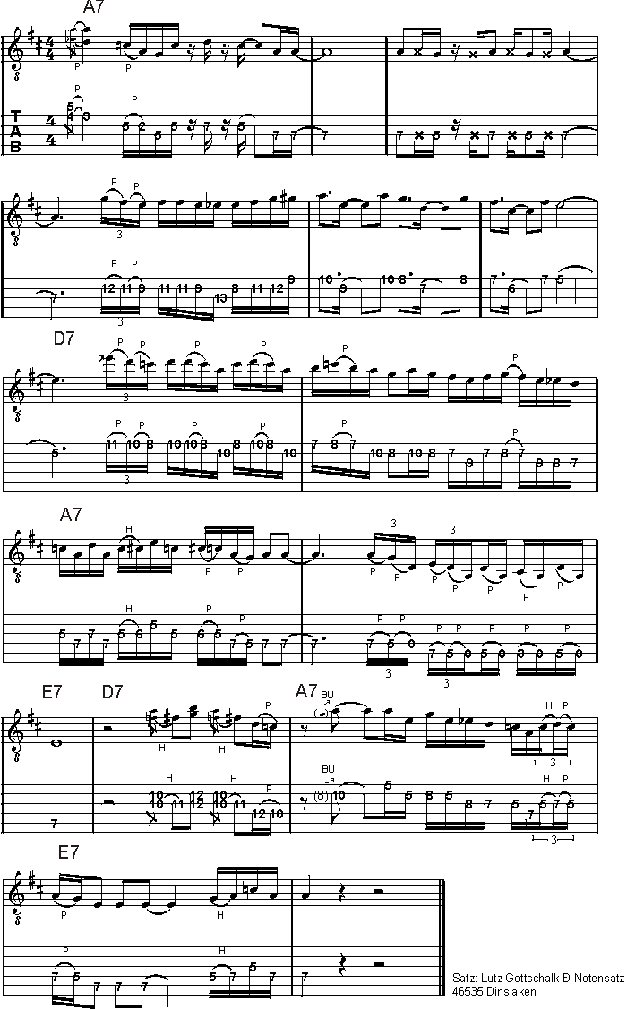 ÜBRIGENS: Ein Klick auf das verkleinerte Notenbild öffnet ein neues Fenster und unterstützt ein problemloses Ausdrucken des Materials. Die Basis für das New Blue Solo bildet -bluestypisch- die gute alte A Moll Pentatonic/Blues Scale. Falls du nicht alle Skalen-Positionen parat haben solltest, ist das kein Beinbruch. Schließlich sind wir doch im Internet! Die entsprechenden Fingersätze kannst du dir hier ausdrucken. Die AnalyseDie Lix in den ersten drei Takten des Solos bestehen ausschließlich aus Tönen der A Blues Scale. Den Einstieg in die Impro gestalte ich mit einem interessanten Doublestop Riff. Wichtig für eine perfekte Ausführung ist die Einhaltung des angegebenen Fingersatzes. Der zweite Takt dient zum Luftholen, bevor es in Takt Numero drei rhythmisch richtig zur Sache geht. Die eingestreuten Scratches sorgen für die perkussive Power, machen die Umsetzung aber nicht unbedingt einfacher. Den Übergang in den eingeschobenen Zwischenteil (Takte 5/6, siehe auch Teil 1) gestalte ich dann mit einer interessanten Kombination aus mehreren musikalischen Mechanismen. Weitere Details zum Thema findest du auf der nächsten Seite. Um dir die Möglichkeit zu geben, die angesprochenen Pattern vernünftig und in Ruhe zu studieren, haben wir dir zunächst einmal eine Flash Animation angefertigt, in deren Audio Part eine Slo-Mo Version der ersten vier Takte zum Einsatz kommt. Klicke auf "Play" und lerne!