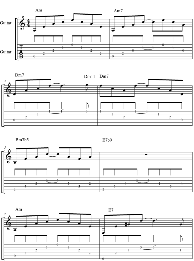 Bis auf E7b9 und E7 stammen alle verwendeten Akkorde aus der normalen A-Moll Scale. Mit den theoretischen Hintergründen wollen wir uns aber erst im zweiten Teil intensiver beschäftigen. Heute soll sich zunächst einmal alles um das Lernen der Chords und Scales drehen. Genau, du hast richtig gehört: die wichtigsten Skalen-Fingersätze haben wir dir nämlich auch noch mal vorbereitet. Dann hast du alles auf einen Blick und brauchst nicht erst in die Scale Zone zu verduften. Also bedien´ dich. Ich sage schon mal "Tschüß" und viel Spaß beim Üben.