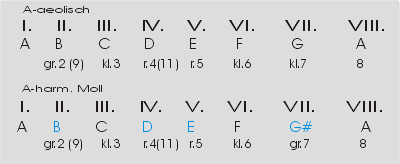 In Takt 6 wird es richtig interessant. Die bereits im ersten Teil angedrohte A Harmonisch Moll Scale kommt ins Spiel. Und die hat es wirklich in sich. Zur Erklärung müssen wir allerdings ein wenig ausholen. Also,hier die Bedienungsanleitung in aller Kürze: Die harmonische Moll Scale leitet sich von der "normalen" aeolischen Mollskala ab. Im Gegensatz zu dieser (A B C D E F G A) wird bei der harmonischen Moll-Tonleiter allerdings der siebte Ton um einen Halbtonschritt erhöht (A B C D E F G# A). Die Fachwelt spricht in diesem Zusammenhang von einem künstlich erzeugten Leitton, der sich chromatisch (im Halbtonabstand) zum Grundton A hin auflöst. Und genau dieser Ton ist es, der nicht nur den Sound der Scale bestimmt, sondern auch noch einen massiven Einschnitt in die Akkordstruktur der Tonleiter mit sich bringt. Zur besseren Verdeutlichung des Sachverhalts schauen wir uns die beiden Skalenvarianten unter exakt diesem Aspekt einmal etwas genauer an: