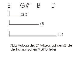 Der klitzekleine Eingriff in die Struktur der Tonleiter sorgt unter anderem dafür, dass auf der fünften Stufe der harmonischen Mollskala ab sofort kein normaler E-Moll Akkord zu finden ist, sondern ein reinrassiger E7 Dominant-Sept Akkord (blau markiert). Das Coole: der ist bekannt für seine Eigenschaft, sich perfekt im A-Moll Akkord der ersten Stufe aufzulösen, besitz also echte Dominant-Qualitäten. Und damit kann der E-Moll der normalen A-Moll Scale nun mal nicht aufwarten.