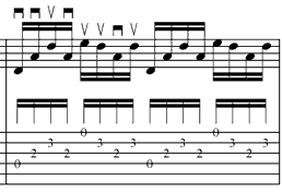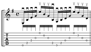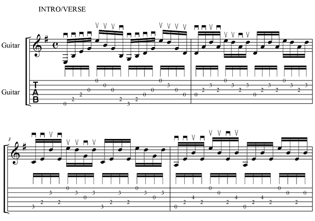 Schauen wir uns die Chords einmal im Detail an. Los geht´s im Intro/Verse mit einem normalen Em Akkord. Den zweiten Teil des Takts bestreitet Mike mit einem G6 Akkord, einer Variation eines normalen G-Akkords, die durch die Hinzunahme der leeren E-Saite zum "6er" Akkord mutiert. Zeitgleich doppelt er die Quinte (D) auf dem 3.Bund der B-Saite. Greife diesen Ton auf jedenfall (wie im Griffbild angegeben) mit dem vierten Finger. Das vereinfacht den Wechsel zum nächsten Akkord (Dsus2) enorm, da auch hier der Ton auf der B-Saite benötigt wird. Seinen coolen, schwebenden Sound erhält der Dsus2 durch das Mitspielen der leeren, hohen E-Saite. Um dies zu realisieren, muss die bei einem D-Dur Akkord normalerweise an dieser Stelle platzierte große Terz (F#), weggelassen werden. Und genau diese Aktion macht den normalen D-Dur zu einem Dsus2 Akkord. INFO: Das Kürzel "sus" steht für "suspended" und bedeutet einfach erklärt, nichts anderes, als das die Terz eines Akkordes ersatzlos gestrichen und durch wahlweise die "2" (sus 2,zweiter Ton der Tonleiter ) oder die "4" ( sus4, vierter Ton) ersetzt wird. Und du wirst es nicht glauben: auch der nächste Akkord Cadd9 arbeitet mit dem D auf der B-Saite. Du kannst den vierten Finger also getrost liegen lassen. Der Chord basiert auf einem normalen C-Dur Griff, der durch das Hinzufügen der None (D, der neunte Ton der C-Dur Tonleiter)zum wohlklingenden Cadd9 erweitert wird. Anders als bei seinem Vorgänger Dsus2, bleibt die Terz dabei allerdings erhalten. Mike beendet die erste Sequenz mit einem weiteren sus Akkord, dem Asus2. Genau wie bei seinen "sus Brüdern" fällt auch bei diesem Exemplar die große Terz (C#), der sus 2 (B) zum Opfer. Und die ist in dieser Variante des Akkords gleich in zweifacher Ausführung vertreten: einmal gegriffen im 4.Bd. der G-Saite und einmal "natürlich", in Form der leeren B-Saite. Im fünften Takt geht das Ganze dann wieder von vorne los. Allerdings modifiziert Mike die Akkorde Cadd9 und Asus2 der Takte 7/8 indem er den Asus2 Akkord vorzieht und in 32´teln rhythmisiert anschlägt. Den spontanen Temperamentsausbruch kriegst du nur hin, wenn du die erste 32tel mit einem Abschlag-, und die zweite mit einem Aufschlag anspielst. Die Achtel und die zwei Sechzehntel im letzten Takt können dann getrost wieder mit Abschlägen zum besten gegeben werden. Kommen wir, wie angedroht, zum Picking der Chords. Um dir die Arbeit zu erleichtern, haben wir dir eine komfortable Picking-Version notiert. |